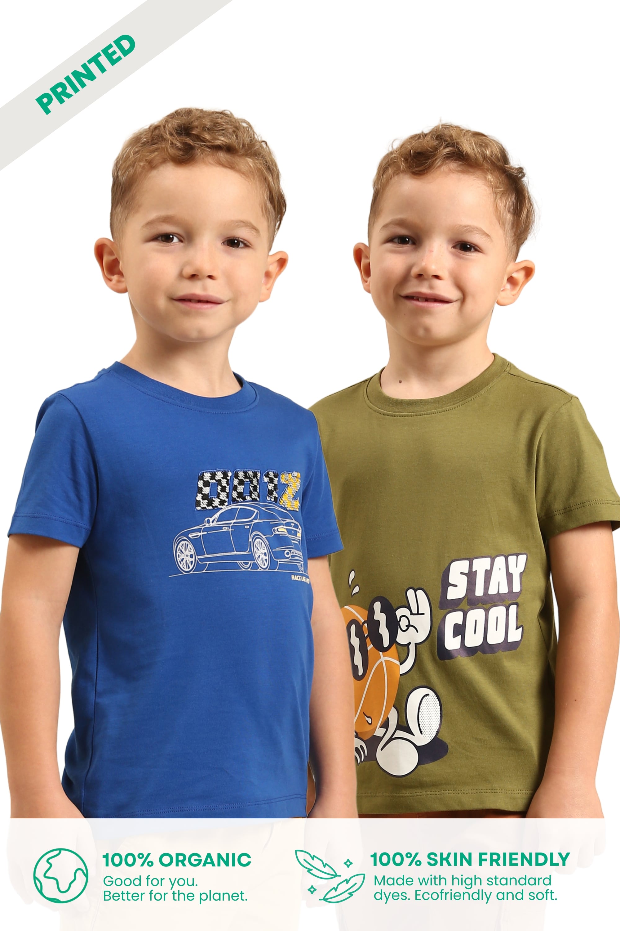 Pack of 2 Cobalt & Olive T-shirts. 1st Tee - Boys' cobalt regular tee. A playful printed with embroidery pattern to brighten up every adventure. Crafted in a regular style that balances freedom and comfort. Rounded round crew neck for a snug, comfortable fit.. 2nd Tee - Boys' olive regular tee. Adorned with a printed design that adds a touch of flair to any outfit. Designed with a regular for a casually cool look. Built with a round crew neck that ensures a great fit every time.